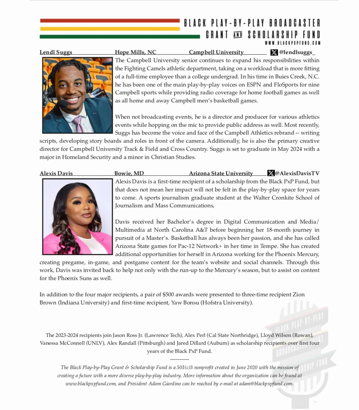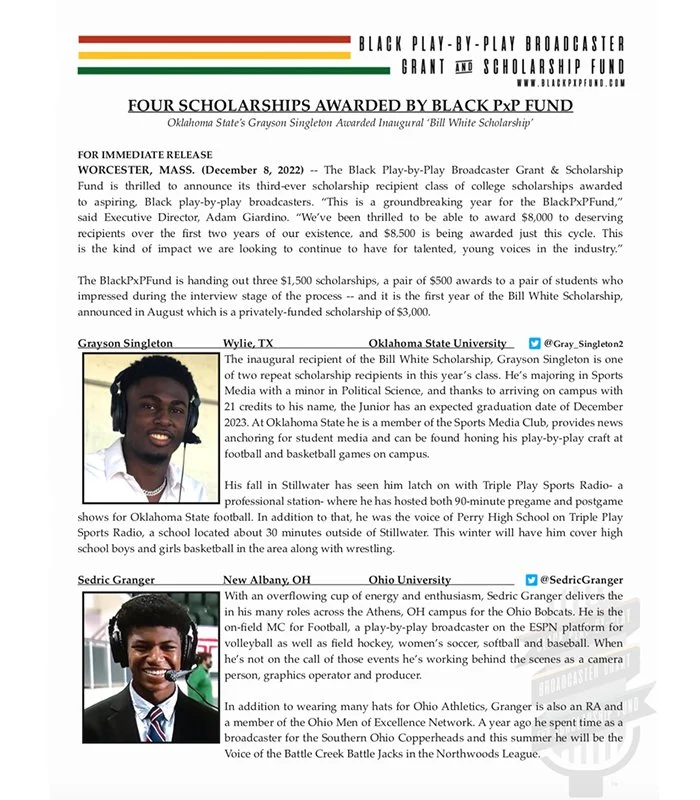 Reinforcing the support of the industry through academic scholarships shows applicants that a career in play-by-play is possible β that the profession is not something unattainable only reserved for a certain set of other people.