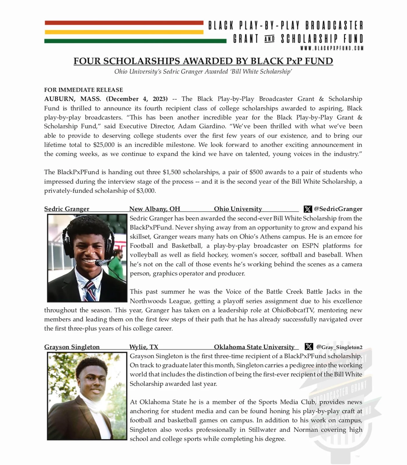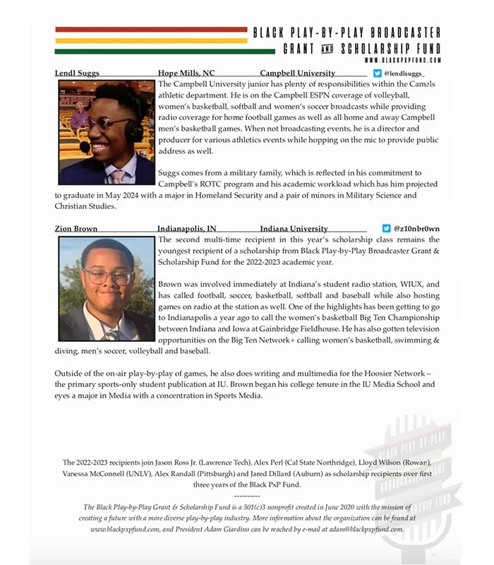 Before ever getting a job in play-by-play broadcasting, it is essential to develop a passion for the craft. The drive to push yourself to get better is imperative, but so is the encouragement and guidance of others. It is through this prism that The Black Play-by-Play Grant & Scholarship Fund wants to identify and support aspiring Black broadcasters while they are still in school.